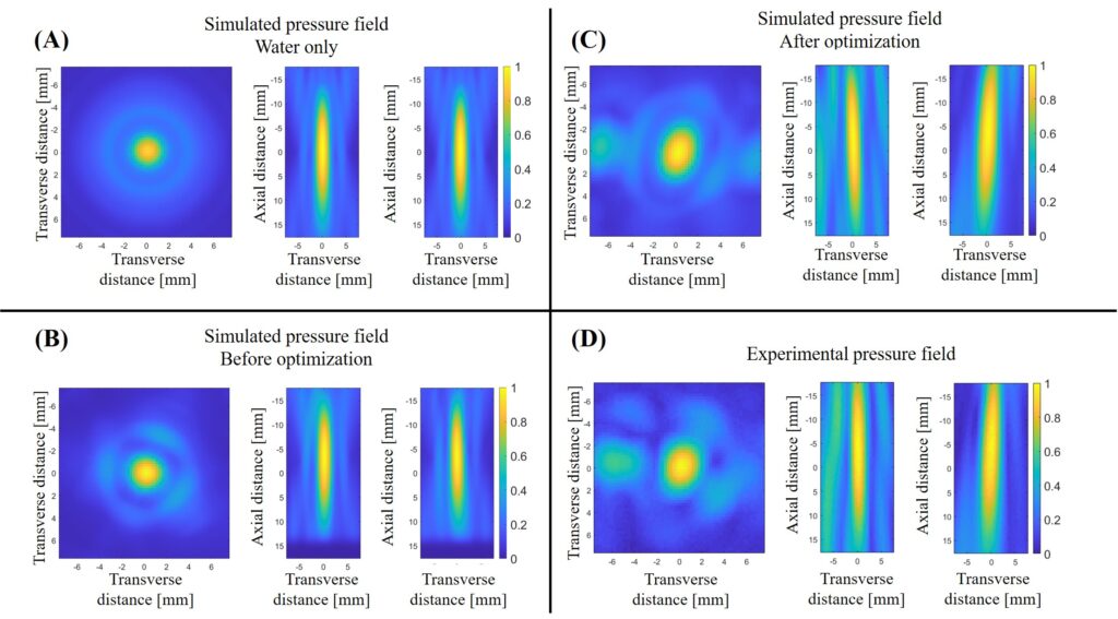 The study describes the development and experimental validation of a model capable of simulating ultrasound focusing through heterogeneous thoracic tissues. Both linear and nonlinear k-space simulations were performed using the k-Wave MATLAB toolbox. The model was validated using in vitro human ribs and porcine flail chest samples, showing excellent agreement between simulated and measured pressure fields (mean correlation coefficient R² = 0.89 ± 0.07 for linear propagation and R² = 0.91 ± 0.06 for nonlinear propagation).